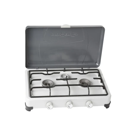Fornello gas a 3 fuochi stabile e compatto, dotato di coperchio.